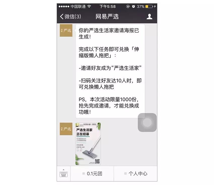 为了进一步扩充知名度,提高微信公众号的辐射范围和自有APP的影响力,此次网易严选通过使用任务宝这一营销工具,以达到增加粉丝的效果。粉丝通过点击网易严选微信公众号自定义菜单,生成属于自己的二维码海报,通过好友扫码关注,指定人数关注后,自己即可兑换奖品。 方式