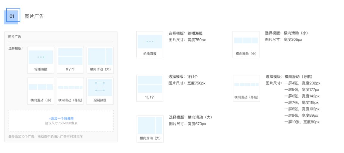 2. 1行1个模式 图片尺寸:宽度750像素,高度不限 最多添加10个广告,可排序。