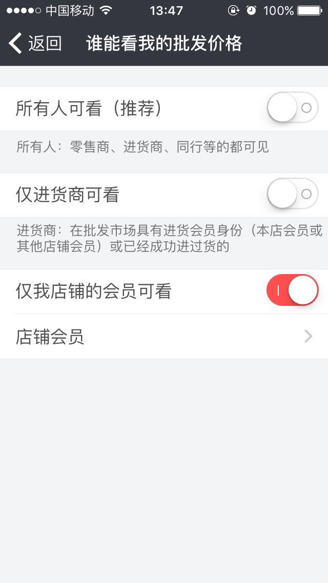 您好,您需要进入批发app-店铺管理-店铺商品隐私管理-谁能看我的批发价格中只打开“仅我店铺的会员可看”才能哦,详见: