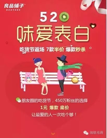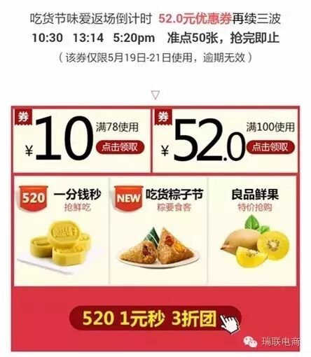 2. 良品铺子; 活动主题:【点击拆开】520表白礼已为你准备好 参与方式:良品铺子借势歌伦贝尔房车音乐节,继续搞爆款特价: ① 粽子1元秒杀; ② 猪脯肉1元特价; ③ 脆冬枣35克4.9元特价; ④ 香卤铁蛋128克6元特价; 另外还有优惠券活动: 52.0元优惠券再续三波:10:30、13:14、5.20PM准点50张,抢完为止。该券仅限5.19日-21日使用,过期无效; 活动亮点:良品铺子的节日营销就是特价买买买。
