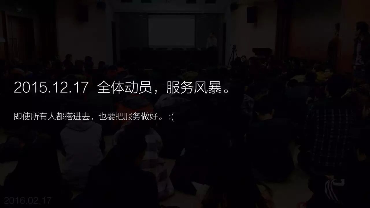 去年12月17日,发现服务还是不好。全公司的同事一起行动,从客服到技术,全部给客户留下手机号和微信,所有人人肉给客户提供服务。口号:即使所有人都搭进去,也要把服务做好。(但是后来发现,其实这么干还是做不好服务。因为完全服务不过来每天的客户咨询)