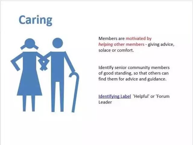 指社区间的用户是被“助人”驱动的,用户间会给与建议、安慰。案例给到的是 Yahoo 的 Health Expert Blog, 是个公益互助博客。 这类社区使用荣誉体系目的:帮助普通用户找到资深用户,使得他们得到帮助。