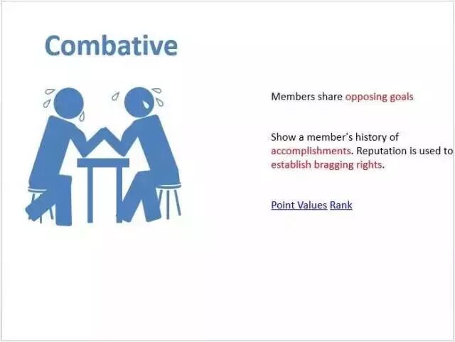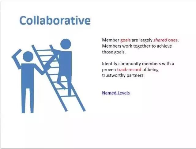 例如金牌银牌铜牌会员,适合“合作的”社区; 社区的成员需要计算自己的个人成长,需要了解自己进步了多少,自己和社区互动有多深。同时同样的测量单位可以用来比较成员的参与度;比 Ranking、Points、Numbered Levels 少一些竞争性。