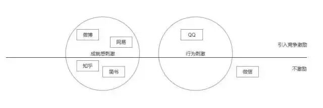 微信、QQ 的用户间没有竞争性。但 QQ 引入了竞争。而且它对用户进行的是行为激励。 知乎、简书、微博、网易鼓励自我实现。只不过知乎、简书没有使用奖励来鼓励自我实现。而网易、微博使用了奖励,引入了竞争。