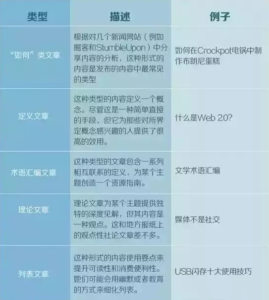 以下分享一个非常实用的写作指南,列出了五种最受欢迎的文章类型及特点。作者为Entrepreneurs-Journey.com的创始人Yaro Starak: