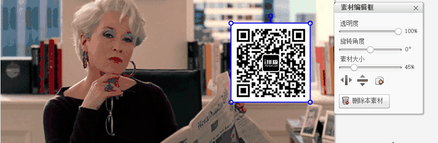 ▲二维码导入以后可以根据自己的喜好进行修饰,比如让二维码变得稍微透明一些(透明也可以扫描),还可以调整大小和位置。