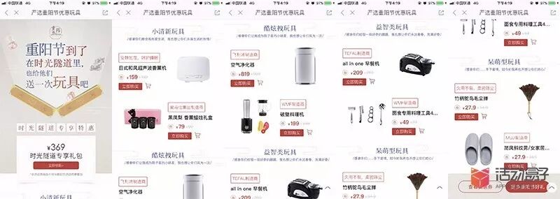 既然电商APP的节日活动营销,必然会有商品促销信息,只不过在重阳节的时候,商品促销会与节日有相关。网易严选APP的时光隧道板块,为用户提供了玩具主题的商品,通过上边的H5页面,将用户引导到商品促销页面,促进商品的购买转化。