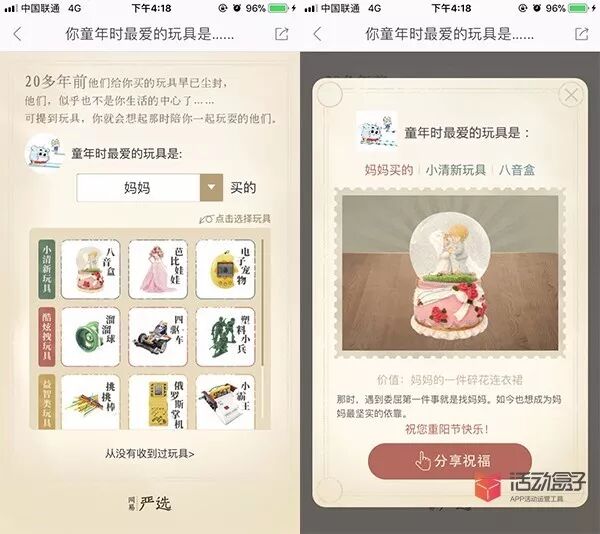 你童年时,最喜欢的玩具是什么呢?网易严选APP为用户提供了选择,用户可以选择孩提时最喜欢的玩具,并且把它分享出去。