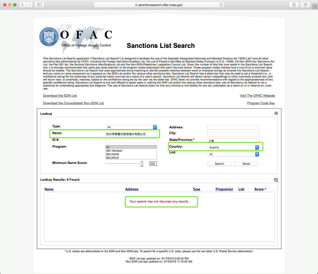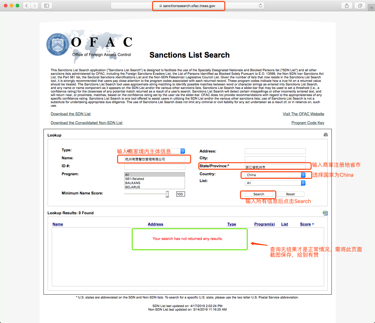 6、OFAC制裁名单(The Office of Foreign Assets Control),保存查询结果(http://sanctionssearch.ofac.treas.gov/); (需要商家不在这个名单里)境内外公司主体、境内外法定代表人(法人身份证为港澳台的需要中英文查询两次,大陆身份证中文查询即可)(见以下详细示例);