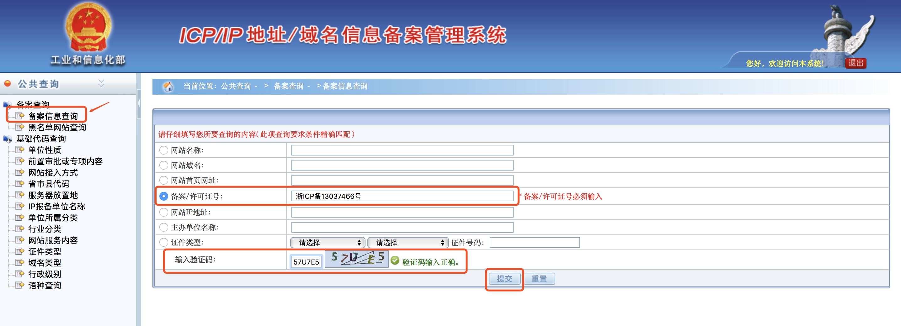 5、在工信部网站核查商户网站域名的ICP备案(http://beian.miit.gov.cn/publish/query/indexFirst.action),拷屏保存;商家有则提交, 如果没有则不用提交;