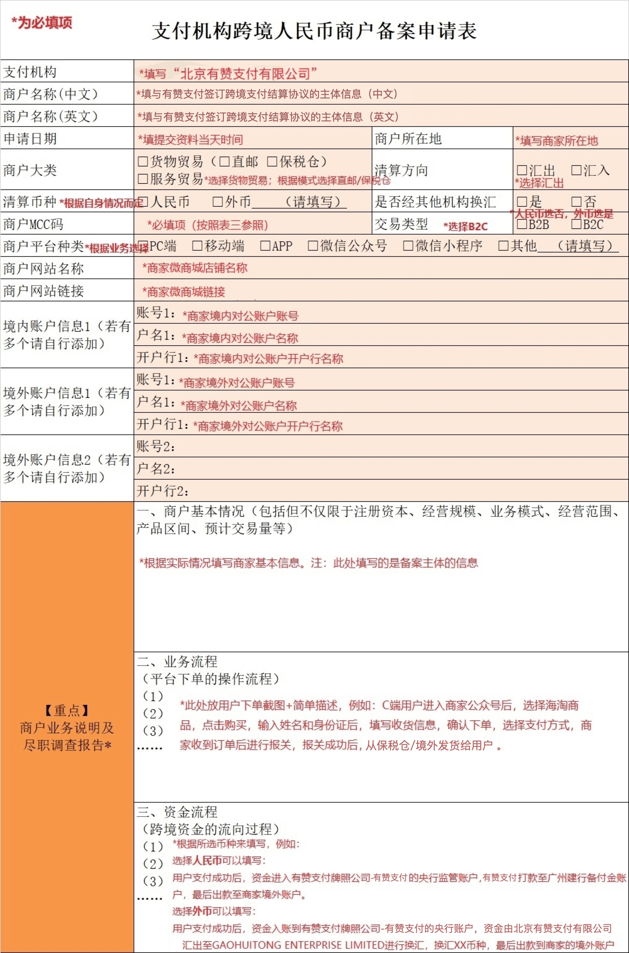 注:商家希望开始跨境结算的订单时间。如果商家已经在使用其他机构出款则填一个约定的时间由我们出款;如果从未做资金出境,可填2019年5月10日(不得早于5月10日)。 三、资料填写指导1、《支付机构跨境人民币商户备案申请表》、《商户备案材料清单》